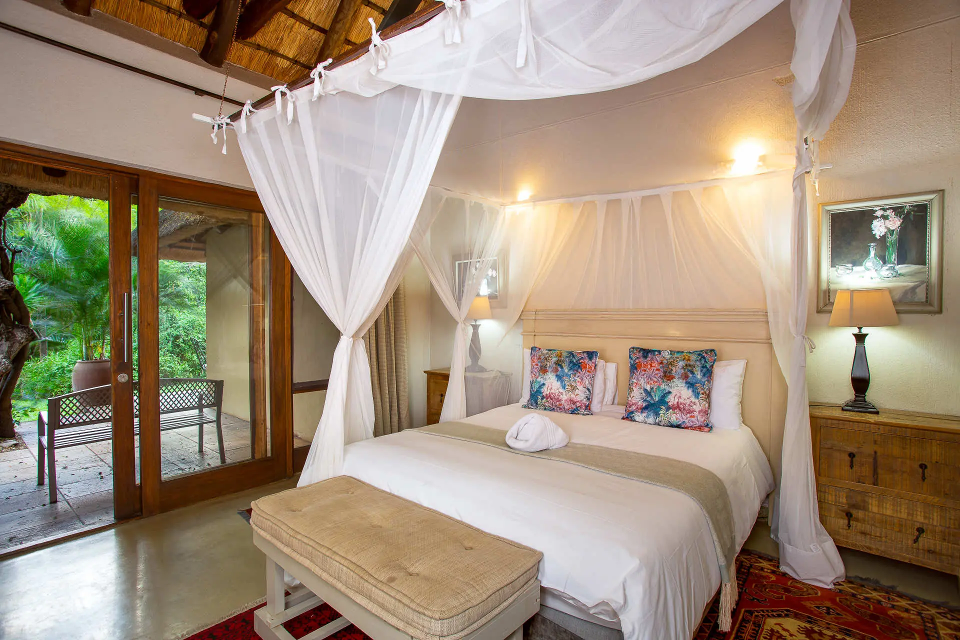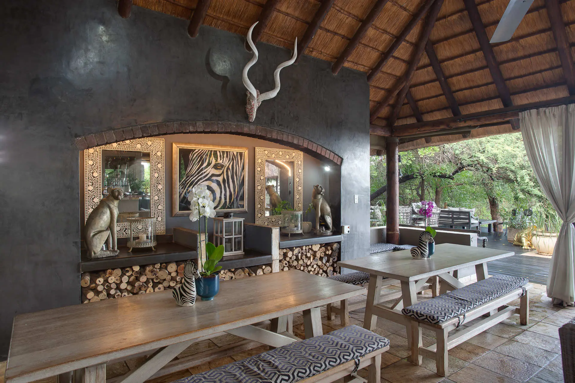 Khaya Ndlovu means “Home of the Elephant” in Zulu; and from the moment the iron gates open, you understand why. It is a home that has chosen to share itself. The interiors are dense with character: original African artwork, shelves of field guides and poetry, candlelight that catches the grain of hand-carved furniture. Outside, the reserve stretches unbroken into the Greater Kruger ecosystem.